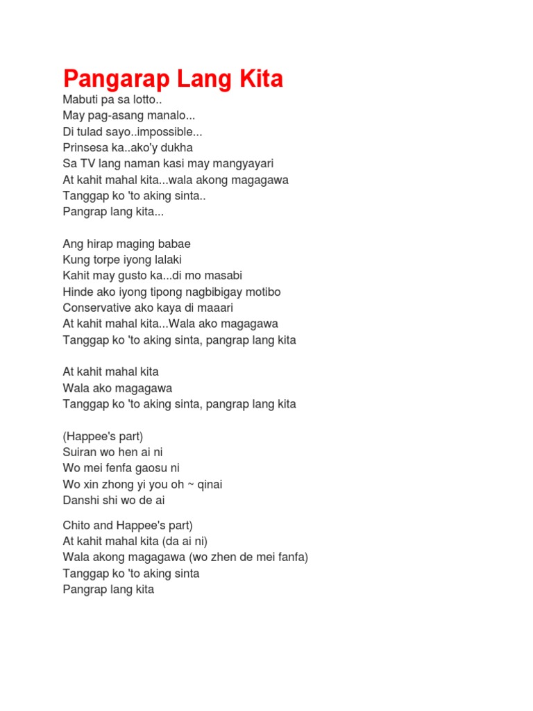 Pangarap lang kita in english. Translation of Pangarap Lang Kita by Parokya ni Edgar from FilipinoTagalog to English Deutsch English Espaol Franais Hungarian Italiano Nederlands Polski Portugus Brasil Romnă Svenska Trke Ελληνικά Български Русский Српски العربية فارسی 日本語 한국어. 6252018 English translation of lyrics for Pangarap Lang Kita by Parokya Ni Edgar feat. 37 talking about this.
