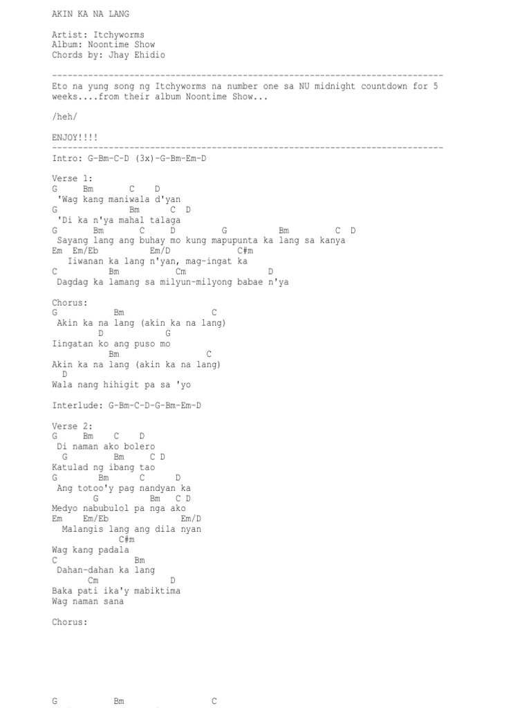 Akin Ka Na Lang chords by Itchyworms with chords drawings easy version 12 key variations and much more. Choose and determine which version of Akin Ka Na Lang chords and tabs by Itchyworms you can play. G Akin ka na Bm lang akin ka na la C ng Iingatan D ko ang puso m G o.