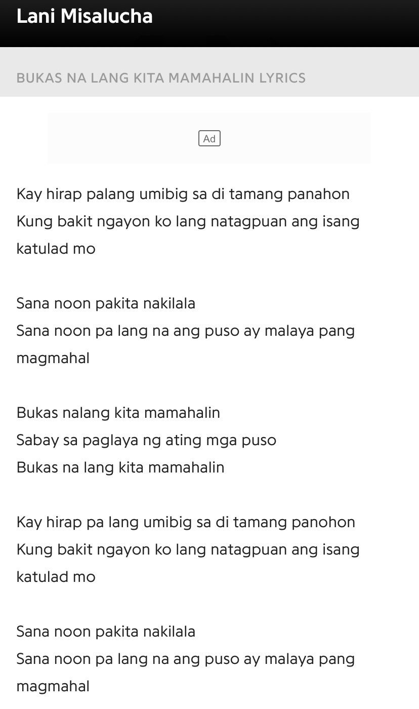 The Lani Misalucha Bukas Na Lang Kita Mamahalin are brought to you by Lyrics-Keeper. 662014 Bukas Na Lang Kita Mamahalin by Lani Misalucha Tagalog Lyrics Kay hirap palang umibig sa di tamang panahon Kung bakit ngayon ko lang natagpuan ang isang katulad mo Sana noon pa kita nakilala Sana noon pa lang na ang puso ay malaya pang magmahal Bukas nalang kita mamahalin Sabay sa paglaya ng ating mga. Bukas Na Lang Kita Mamahalin Lyrics.