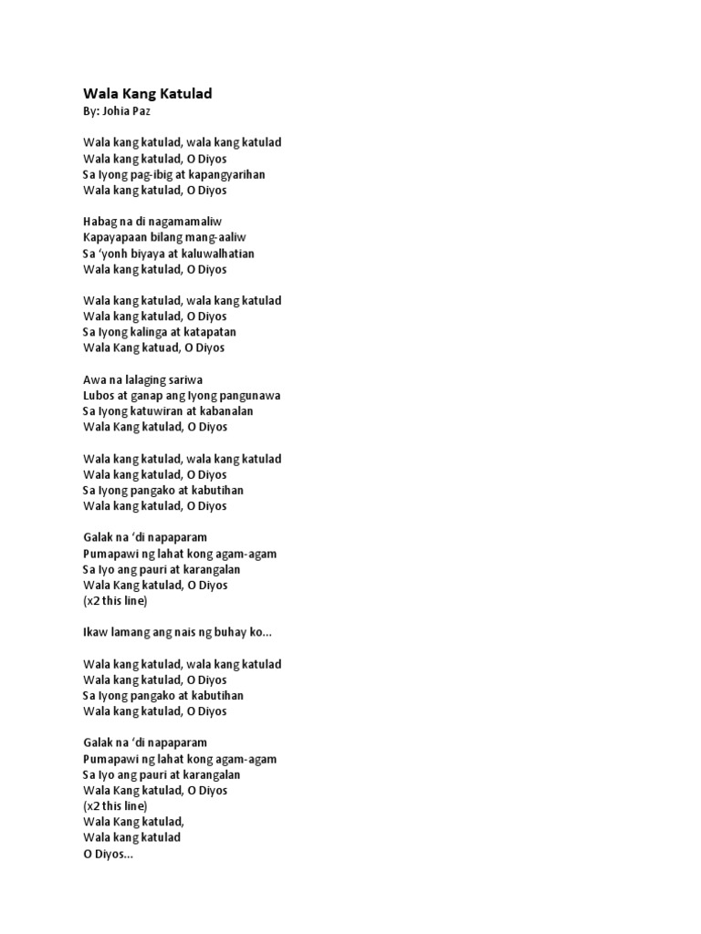 12192012 Free printable and easy chords for song by Faith Music Manila - Wala Kang Katulad. Wala kang katulad G A Wala nang hihigit sayo D D7 Wala kang katulad G A Wala nang papantay sayo Fm Bm Ikaw ang Diyos noon pa man Fm Bm Maging ngayon at kailanman G Sa habang panahon A D A7 Wala kang katulad. Verse D A Awitin ko man Fm Bm Lahat ng awit sa mundo G Em Ay di kayang ilarawan E A Ang Kadakilaan mo G A Kulang ang lahat ng tula Fm Bm Kulang maging mga salita G Upang ihayag E A Ang kabutihan mo Chorus D Em Fm Wala kang katulad G A Wala nang hihigit sayo D Em Fm Wala kang katulad G A Wala nang papantay sayo Fm Bm.